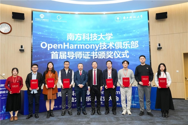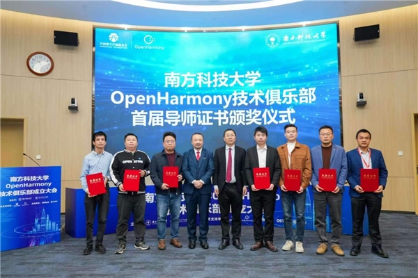 会中,陈海波和沈平共同为九位高校导师:张青峰、嘉有为、张锋巍、张进、唐茗、吴光、徐琳琳、唐博、陈亮名,以及九位企业导师:常瑞华、杨轩、唐松龙、连志安、黄鸿波、吴兴、石伟、程胜春、张元方颁发了南方科技大学OpenHarmony技术俱乐部首届导师证书。