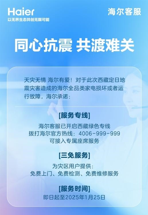 此外,海尔服务已开通三免服务,为海尔系全品类家电免费上门、免费检测、免费维修,并预备好服务兵8人,车辆2辆,待可进入灾区后实施。海尔客服也针对西藏地区开通专线,确保震区用户拨通直进金牌客服坐席。据了解,海尔智家金牌客服团队是一支专业、高效、富有经验的客服队伍,可为地震受灾区域的用户提供更加及时、有效的帮助,从而减轻他们在灾后的困扰和不便。