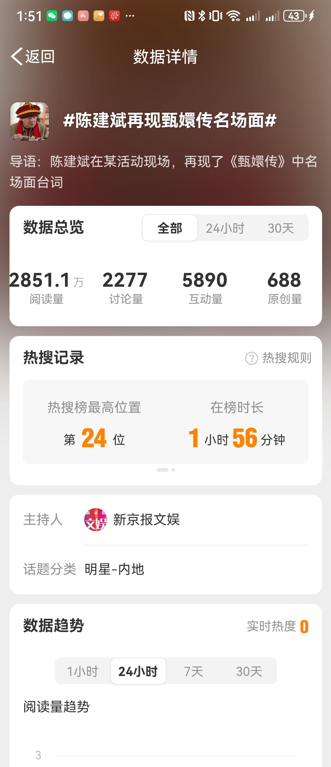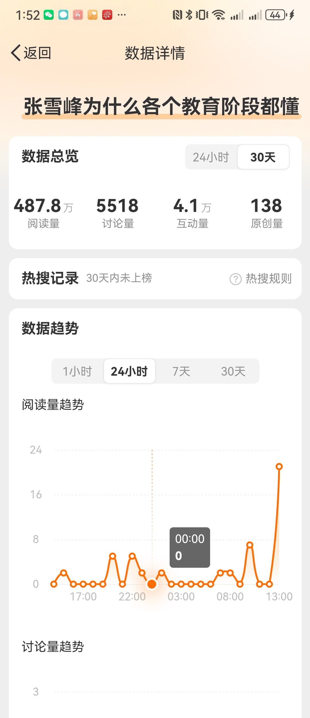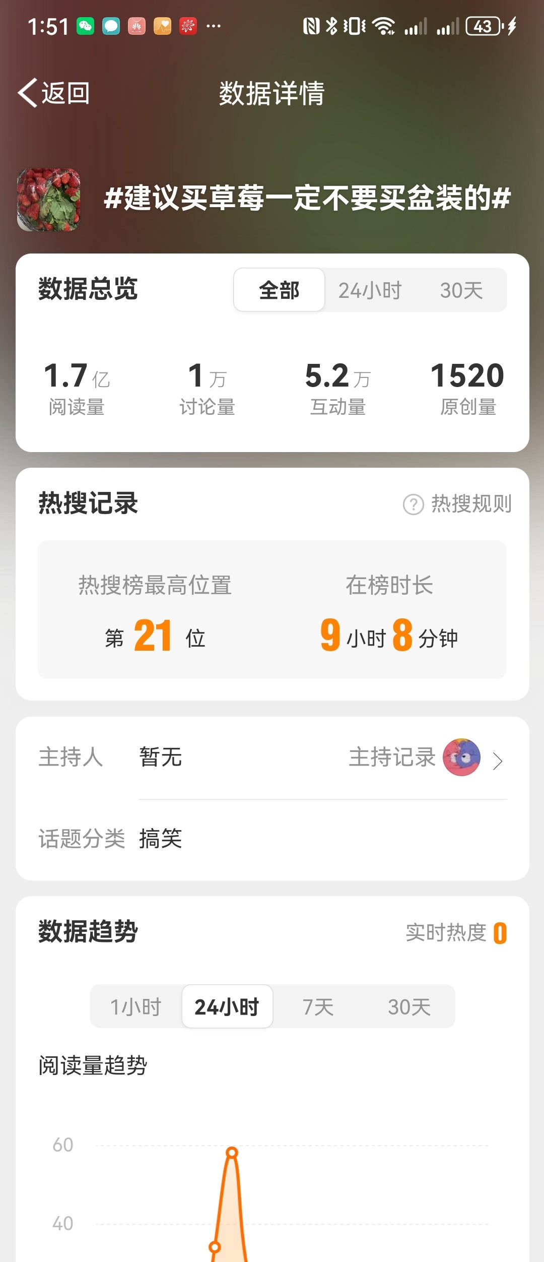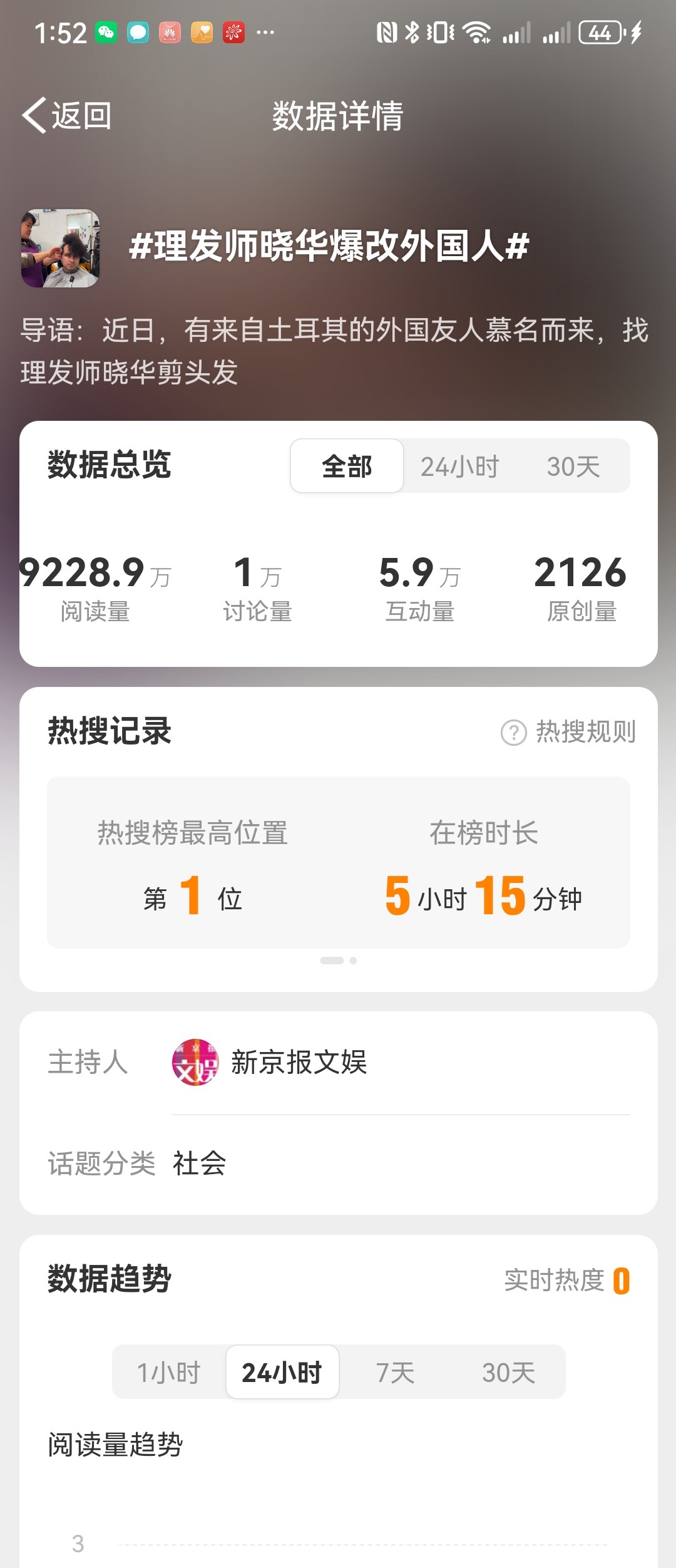 例如,#理发师晓华爆改外国人 话题阅读量9000万+,登上热搜总榜top1,持续霸榜5小时;#张雪峰为什么各个教育阶段都懂 话题登顶热搜母婴榜top1;阅读量1亿+的#建议买草莓一定不要买盆装的,以及阅读量2000万+的#陈建斌再现甄嬛传名场面 两大话题,同样登上热搜总榜。