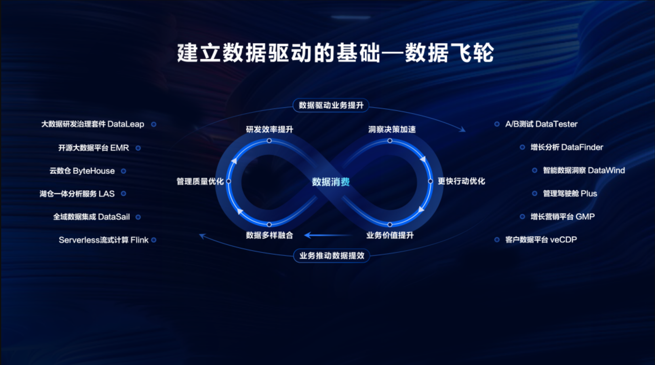 在AI技术加速下,企业可更加快速地处理海量数据,加速数据沉淀;智能分析层面,AI 凭借强大算法挖掘数据价值,使分析更精准、高效;在反馈机制上,AI 能实现实时数据反馈,及时调整优化业务流程。依托AI发力,火山引擎近期在数据应用与数据建设层面,带来了数据飞轮的全新解决方案和实践。其 DataWind ChatBI 能力利用 AI 降低数据消费门槛,提升效率,精准满足企业多业务个性化数据查询与分析需求,解决数据口径不一致等问题,在抖音集团内外部场景中发挥了重要作用。其 “多模态数据湖解决方案”,实现海量多类型数据统一精细化管理,为大模型各训练环节提供更好数据支持,已在泛互联网、汽车等行业应用并取得实效。