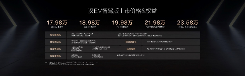 同时,汉智驾版还为用户准备了包括“尊享焕新礼、尊享无忧礼、尊享贵宾礼、尊享智联礼、限时选装礼、延保服务”六重购车礼遇。