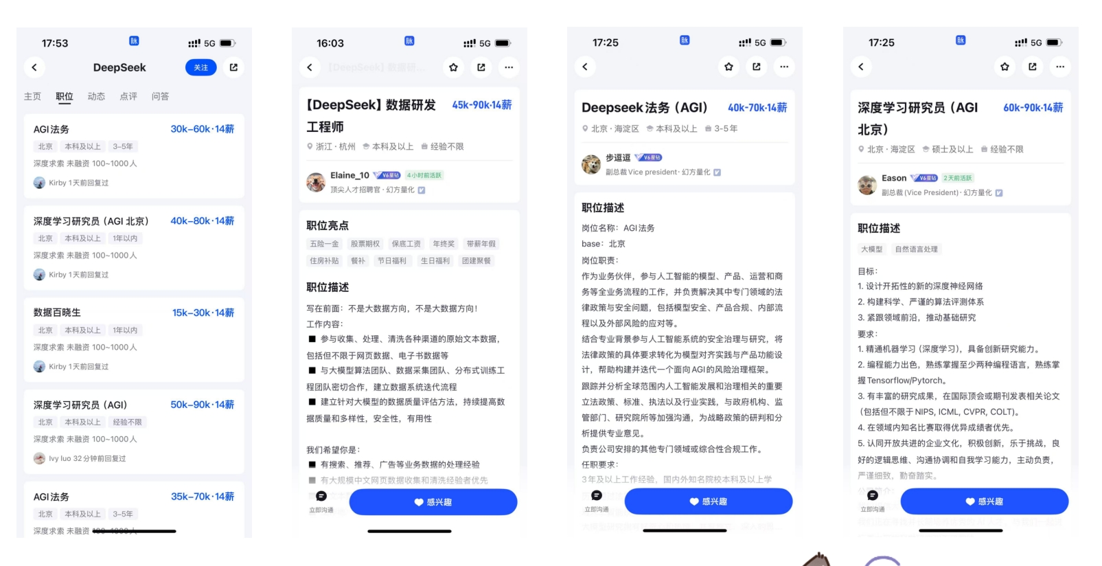 脉脉高聘人才智库数据显示,DeepSeek及其母公司幻方量化在脉脉高聘发布深度学习研究员、硬件技术工程师等多个技术岗位和AGI法务、采购经理、高级运维开发工程师等非技术类岗位,工作地包括北京、杭州。其中AGI深度学习研究员岗位年薪超过120万元。DeepSeek多位高管也在脉脉高聘平台在线“求简历”,涉及大模型研发、财务、法务、实习生等多个岗位。