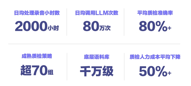众安信科AI质检平台历经了众多实战的严苛考验,更沉淀了大量能够长期赋能客户的数据资产。数千小时日均处理录音时长和近百万级的日均调用大模型次数,展现了AI质检平台强劲的性能和强大的AI能力支撑。平均质检准确率超过80%,而人力成本也能显著降低。