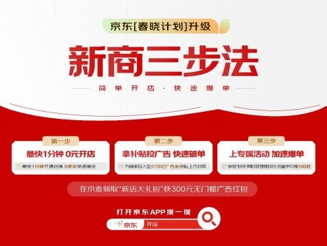 近日,京东宣布升级“春晓计划”,重磅推出“新商三步法”,包含“0元开店、拿补贴投广告、上专属活动”三大步骤,为新商家提供了简单、明确、有效的开店指南,新商家只需跟着步骤操作,即可快速起量、加速爆单。