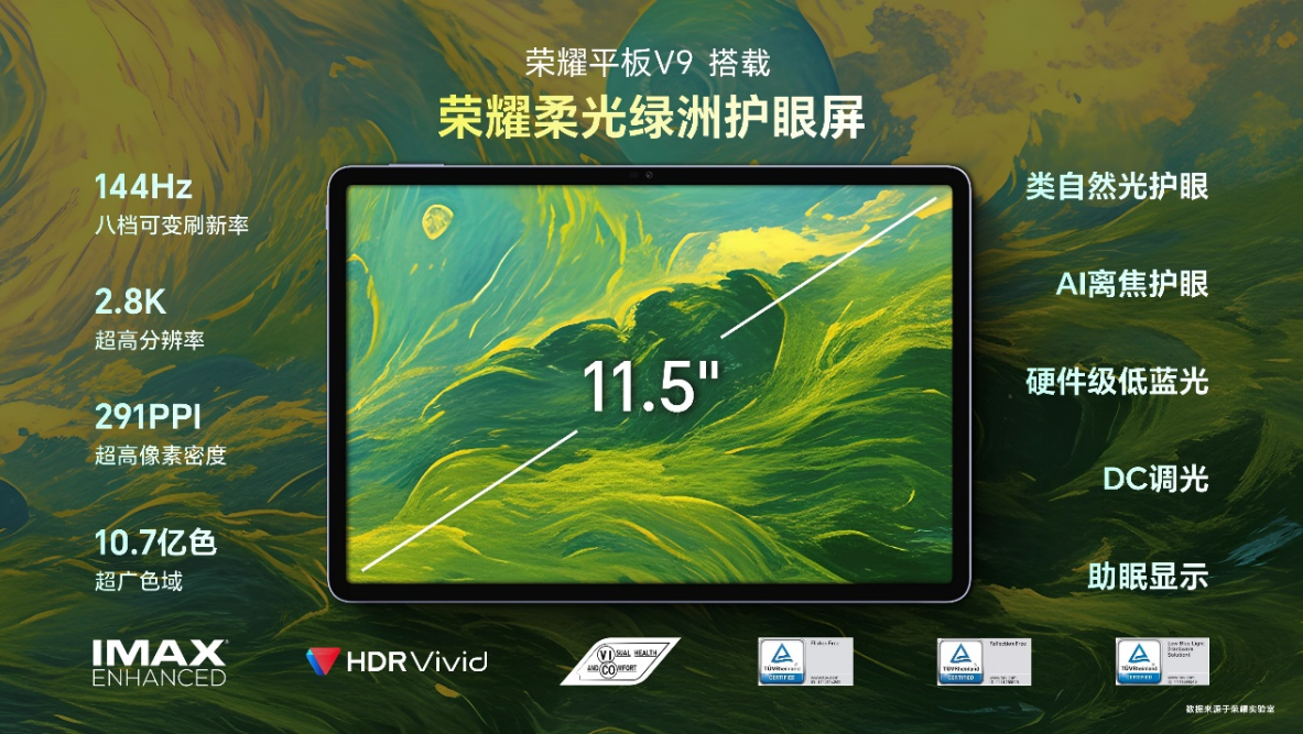 硬件方面,荣耀平板V9以仅475g的重量和6.1mm的机身厚度,成为同尺寸级别最为轻薄的产品之一,产品搭载11.5英寸荣耀柔光绿洲护眼屏,拥有2.8K超高清分辨率和10.7亿色超广色域,并通过类自然光护眼、AI离焦护眼、助眠显示等有效减轻视觉疲劳。续航上,荣耀平板V9配备了同尺寸断档式领先的10100mAh大容量电池,可以实现13小时以上连续短视频或阅读,还能实现80天的超长待机和620天的超长保电,做到拿起即用。