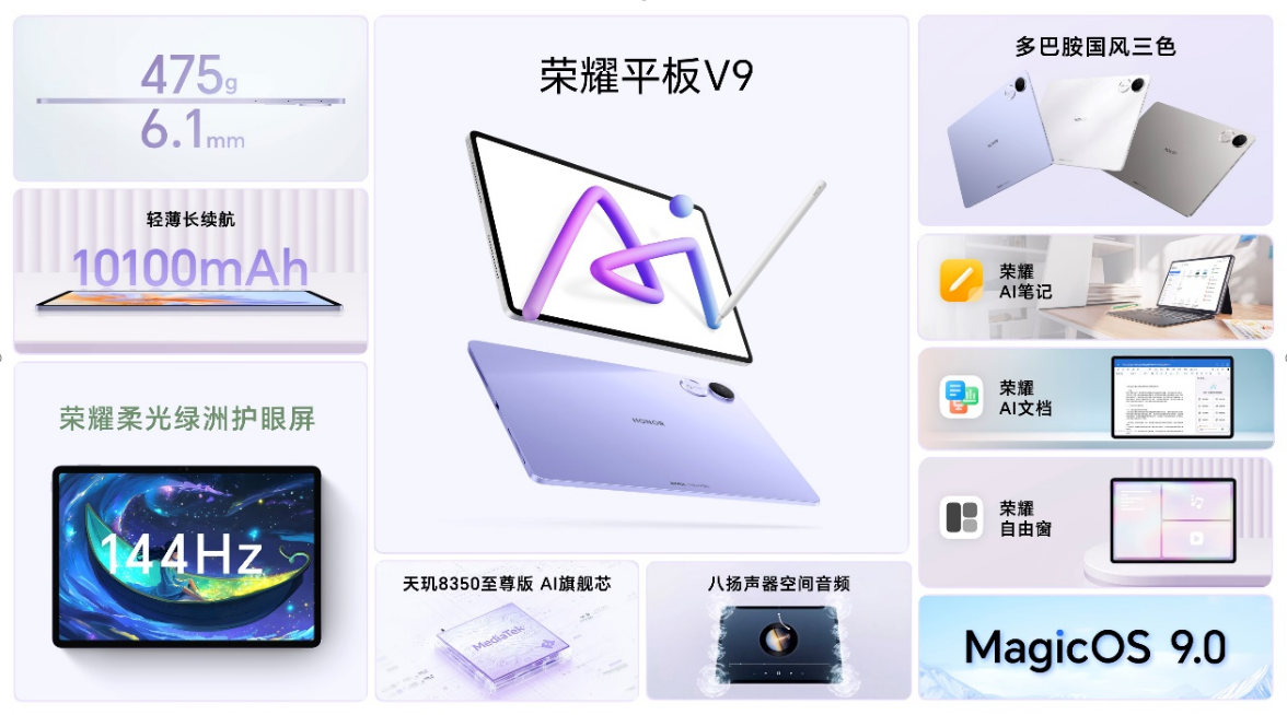 作为平板行业的头部厂商,荣耀推出了多款平板产品,满足了消费者多样需求。其中,荣耀平板V9是面向学生人群推出的AI学习平板,致力于打造0学习门槛、一站式无跳转、场景全流程的AI学习体验,通过荣耀AI文档、荣耀AI笔记、荣耀自由窗等功能,引领AI无纸化学习新时代。
