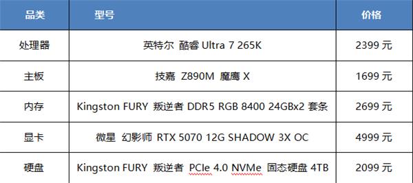 英特尔酷睿Ultra系列处理器中,根据核心数量、线程数量、频率多方面考量,再参考价格,英特尔酷睿Ultra 7 265K无疑是其中高性价的代表产品。拥有8大核12小核20线程,大核频率3.9-5.5GHz,小核频率3.3-4.6GHz,二级缓存36MB,三级缓存30MB。与之匹配的主板选择了技嘉Z890M魔鹰X,8+1+2供电模组,四条内存插槽同样支持DDR5 8800+MT/s,最高支持256GB,还有1个PCIe 5.0 x16以及3个M.2插槽,其中1个支持PCIe 5.0x4,2个支持PCIe 4.0x4,可扩展性十分充裕。
