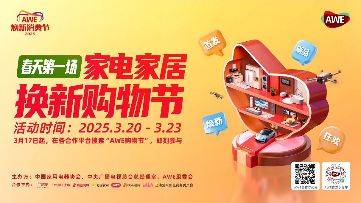 中国家用电器协会、中央广播电视总台总经理室及AWE组委会将携手上海浦东新区商务委,联合京东、天猫、抖音、苏宁易购、小红书、快手、bilibili等平台,共同推出融合多元消费场景的“AWE焕新消费节”,让消费者不仅能在AWE2025现场体验新品、更可以通过线上选购并享受政策优惠。值得关注的是,董宇辉、王冰冰将来到AWE直播逛展。目前,活动已上线各大平台,搜索“AWE购物节”,即刻参与!