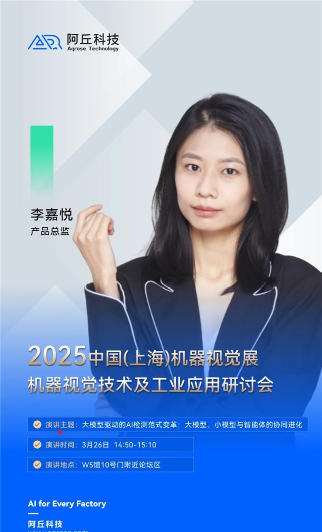 3月26日下午14:50,阿丘科技产品总监李嘉悦将在机器视觉及工业应用研讨会现场(W5馆),围绕“大模型驱动的AI检测范式变革:大模型、小模型与智能体的协同进化”的主题,发表精彩演讲。