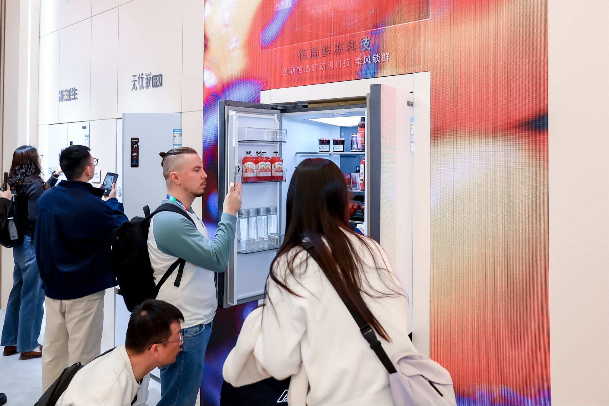 在冰洗区域,长虹美菱纯色系列新品高容全嵌冰箱——大白鲸冰箱颇为引人注意。60分钟即可AI急速制冰与超薄平嵌的结构设计,让年轻人的家居生活美感与体验感快速升级。此外,M鲜生、冻鲜生、无忧嵌pro、全隐嵌冰箱、立式冷柜、冰吧等多款家用、商用制冷设备,以及蓝氧洗烘套装等产品将长虹美菱品牌的技术发展做了全面的呈现。