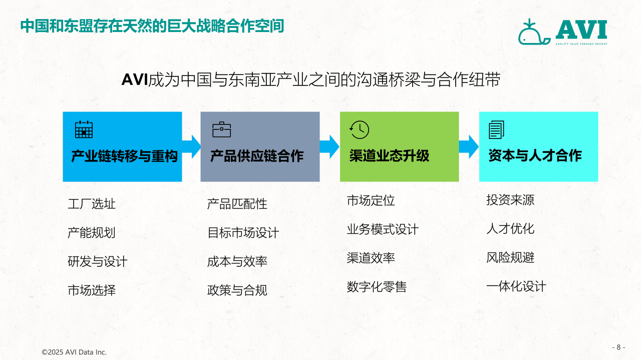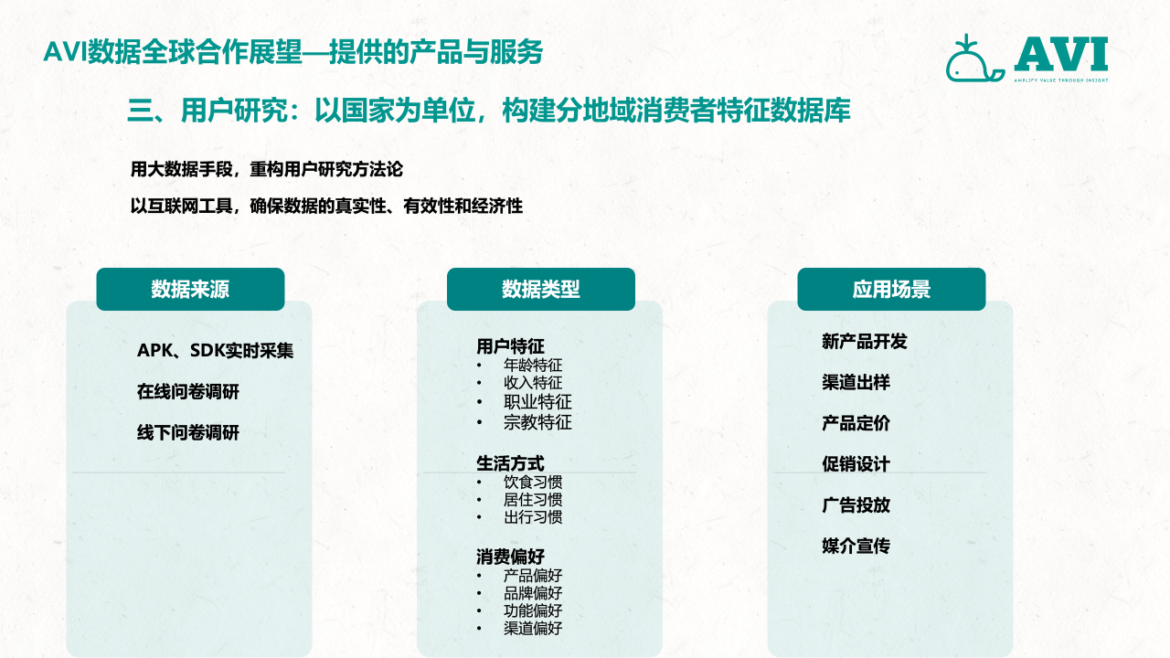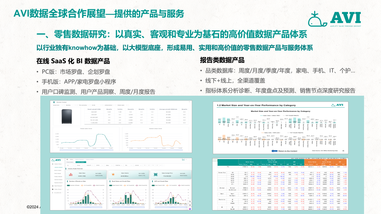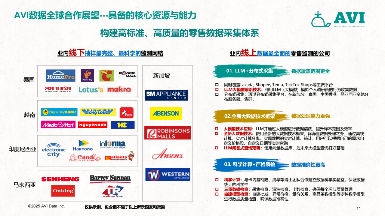 作为中国首家面向全球零售与产业链数据市场的第三方大数据机构,AVI data通过搭建一个覆盖全部线下与线上综合业态的零售数据采集网络,并以国家为单位,构建一套以服务多元化企业的出海需求为目标,涵盖零售、2B工程、上下游产业链投资研发生产、渠道分销、用户需求洞察、售后服务,包括全流程和全价值链的大数据采集和研究服务体系,并通过专业的数据挖掘和分析工具、专业的咨询服务、帮助客户做好更加科学的海外市场开发、渠道管理与投融资管理决策,致力于成为中国企业出海的市场考察“望远镜”、市场投放“指南针”和市场营销“倍增器”,推动行业的创新发展,帮助企业实现内外部跨源数据融合,提升市场洞察力和决策效率。