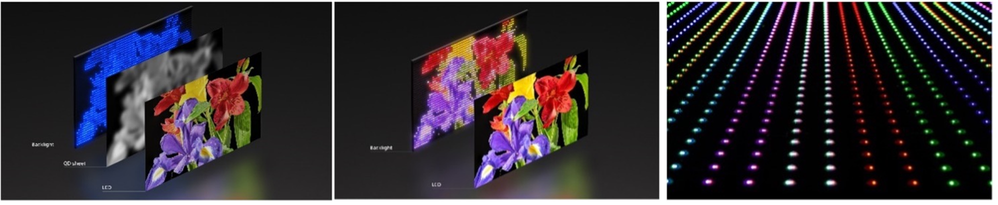 QD Mini LED                            新RGB LED                          新RGB背光系统