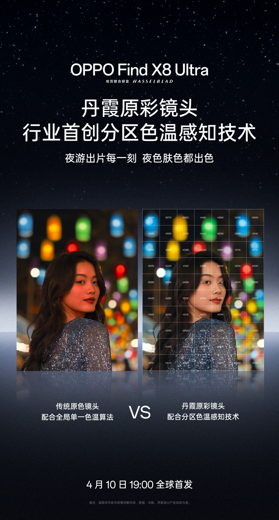 OPPO今日正式宣布,全新Find X8 Ultra将搭载丹霞原彩镜头,通过行业首创的分区色温感知技术,精确检测画面中色温变化的具体细节,解决复杂光源下的人像拍摄难题,重新定义夜景人像摄影标杆,让夜游出片的每一刻,夜色肤色都出色。OPPO影像产品总监张璇表示,丹霞原彩镜头将彻底改变用户对夜景人像摄影的认知,让每次拍摄都能成为完美的回忆。