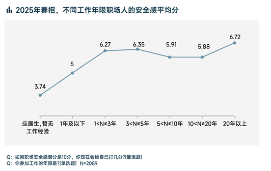 近日,脉脉高聘人才智库发布《2025春招职场安全感洞察》(以下简称“洞察”)。《洞察》显示,新经济行业职场安全感平均值为6.03分,中位数为5.50分(满分10分)。其中,应届毕业生安全感最低,仅为3.47分,远低于平均水平,主要受就业压力及身份转换不确定性影响。3-5年从业者安全感提升至6.35分,而5-20年职场人安全感有所回落,20年以上从业者则回升至6.72分。
