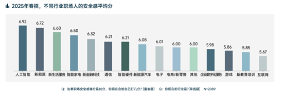 不同行业职场人的安全感差异明显。人工智能行业安全感最高,达到6.92分,远超平均分6.03。互联网与新教育培训行业的职场人垫底,评分仅为5.67分和5.85分,可能受近几年行业波动影响。值得关注的是,正处于洗牌期的新能源汽车行业因市场竞争加剧与企业经营风险,从业者安全感仅勉强跨越及格线,安全感评分为6.08分。