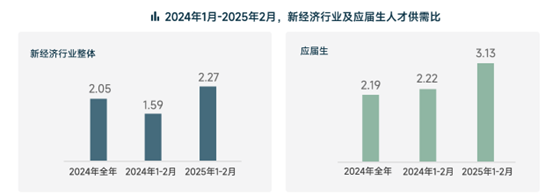 《洞察》显示,在影响职场安全感的因素中,就业市场景气度、企业/组织稳定性、行业周期上/下行位列TOP3。人才市场供需状况直接影响职场安全感。2025年1-2月,新经济行业人才供需比达2.27,即超过2个人竞争1个岗位,同比增长42.8%。而应届生群体面临更大就业压力,人才供需比达3.13,较行业整体水平(2.27)高出37.9%,比2024年同期的2.22增长41%。