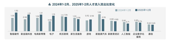 从不同行业的人才流入流出比(>1为净流入,<1为净流出)来看,人工智能、新能源汽车两大热门赛道处于人才净流出状态。人工智能行业的人才流入流出比从2024年1-2月的0.80跌至2025年同期的0.71,《洞察》认为,这种现象或受互联网、电商、游戏等行业持续对AI人才的争夺所致。同时,此前几年持续人才净流入的新能源汽车行业出现关键转折,流入流出比从2024年1-2月的净流入(1.24)转为2025年同期的净流出(0.95),或因竞争加剧导致部分车企组织收缩所致。智能硬件、电商新零售连续两年人才净流入,新金融科技、电子行业打破人才净流出状态,实现人才吸引力逆转。