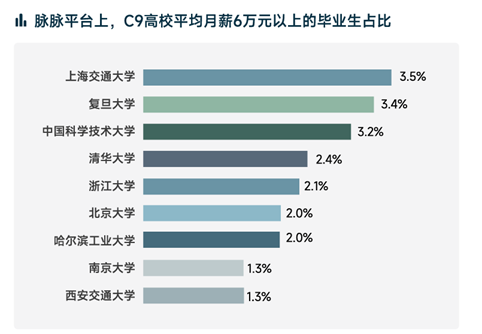 《洞察》显示,在影响职场安全感的个人因素中,“工作能力扛打”以绝对优势成为职场安全感的核心支柱,其次是“名校/高学历”、“工种选得好”、“名企光环”。脉脉“人才银行”数据显示,C9院校月薪6万元以上的毕业生比例存在差异。上海交通大学以3.5%的比例位列第一,与复旦大学(3.4%)、中国科学技术大学(3.2%)组成第一梯队,清华大学(2.4%)、浙江大学(2.1%)、北京大学(2.0%)、哈尔滨工业大学(2.0%)构成第二梯队。