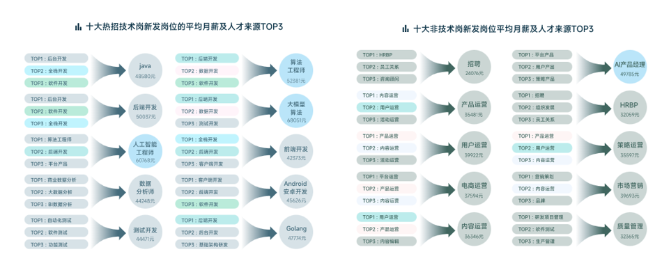 在新发岗位量TOP10的技术岗中,大模型算法(68051元)、人工智能工程师(60768元)、算法工程师(52381元)位列高薪岗位的前三甲。大模型算法、算法工程师岗位都将“数据开发”作为核心能力,而人工智能工程师的人才来源跨界幅度大,甚至包括平台产品人才。而在新发岗位量TOP10的非技术岗中,AI产品经理以49785元的平均月薪领跑,人才来源主要平台产品、用户产品和策略产品。