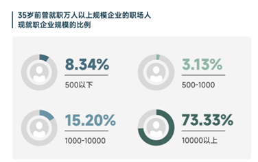 从拥有万人以上规模企业经验的35岁以上职场人选择来看,73.33%仍留在万人以上规模企业,仅15.20%流向千人级中厂,8.34%选择500人以下规模企业。
