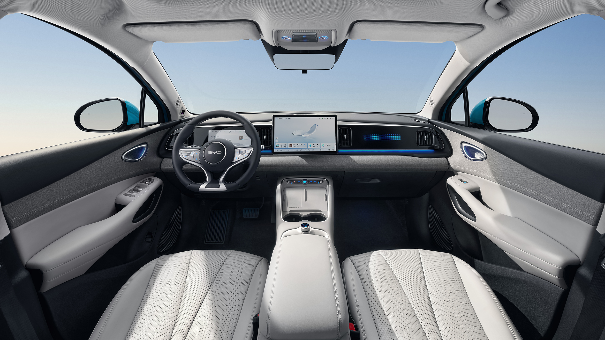 内饰延续海洋美学设计,营造出简约雅致的海蕴座舱。主仪表台采用内嵌式8.8英寸全液晶仪表+12.8英寸高清悬浮Pad,视觉效果开阔,层次感丰富。海狮05EV还采用了怀挡式电子换挡,操作更加便捷。门板处等内饰材质还应用了仿纤维的皮革软包材质,更细腻更耐用,令座舱美感与实用性兼备。