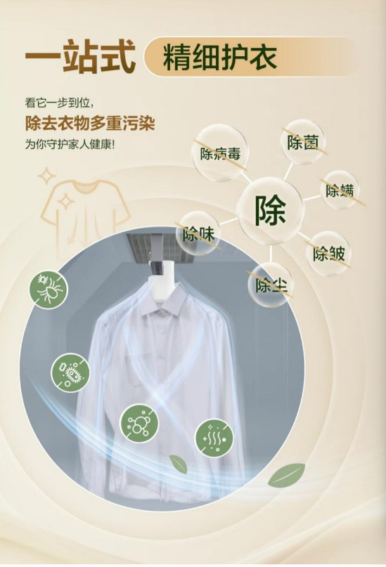 用户回家后,只需将衣物放入玄关处的护理机内即时处理,即可有效阻断细菌病毒传播。这一健康功能不仅能减少高端面料衣物的干洗依赖,还能降低日常衣物的清洗频率,呵护衣物面料的同时节省开支,真正做到让用户省心又安心。