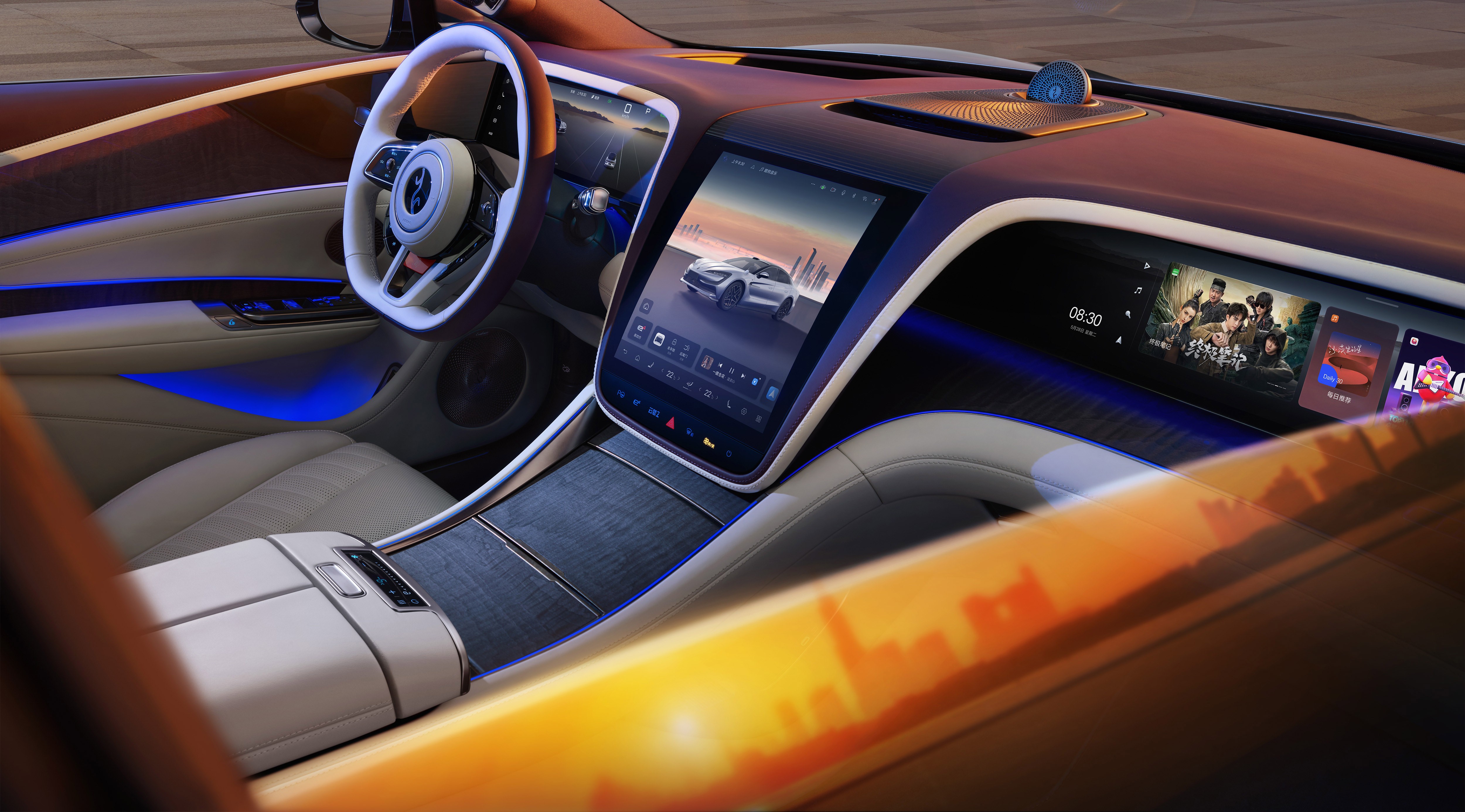 走进舱内,仰望U7双环抱座舱沿袭了中国传统建筑设计中的对称之美,让新能源时代的科技气质与东方审美和谐统一。全车搭载23个丹拿铂金证据系列Hi-End级扬声器,将百万级家用音响的品质移植进车内,提供细致、温暖、自然的纯净声音体验。中轴线上旋转升降的“丹拿星旋”高音单元设计灵感来自日晷,U7 启动时,丹拿星旋旋转、上升,寓意旭日东升,时来运转。仰望U7内饰提供四座旗舰、五座豪华两种版本,以及云锦红、珠缎白两种颜色选择,其中云锦红内饰以赤色的南京云锦为灵感,寸锦寸金、名贵豪华;珠缎白似珠玉般莹润,如缎面般纯净,辅以寓意“紫气东来”的紫色点缀,将东方美学萦绕周围。无论车内车外,仰望U7都在细节处展现出融合东方美学与未来科技的巧思,诠释着中式豪华的温度与高度。