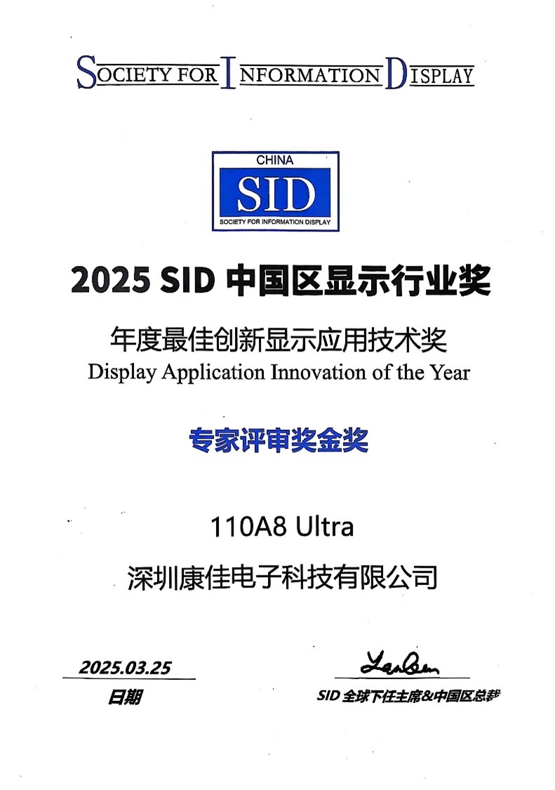 3月25日,在厦门举行的2025年度国际显示技术大会(ICDT)上,康佳电视110A8 Ultra凭借创新实力,一举斩获2025国际信息显示学会(简称SID)中国区显示行业奖年度最佳创新显示应用技术奖专家评审奖金奖。该奖项由SID北京分会技术委员会组成的专家评审组和ICDT参会者联合评审,经过行业70多位行业权威专家严格打分评选产生。康佳电视首次荣获该奖项,打破了面板厂商在该领域的垄断获奖局面,彰显了康佳电视在MiniLED背光分区控光领域的技术创新成果取得显著进展。