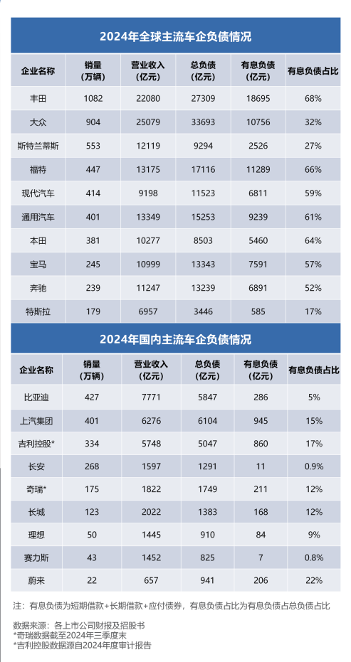 例如,2024年末,大众集团营收2.5万亿元,总负债达3.4万亿元,是同期营收的136%;福特营收1.3万亿元,总负债达1.7万亿元,是同期营收的131%;丰田营收2.2万亿元,总负债达2.7万亿元,是同期营收的123%。通用汽车、宝马、奔驰、现代汽车的总负债也在万亿以上。