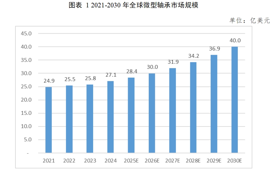 数据显示,全球微型轴承行业市场规模稳步增长。2021年至2024年间,全球微型轴承行业市场规模由24.9亿美元快速增长至27.1亿美元,预计2030年可达到40.0亿美元,2025到2030年间的复合增长率为6.7%。