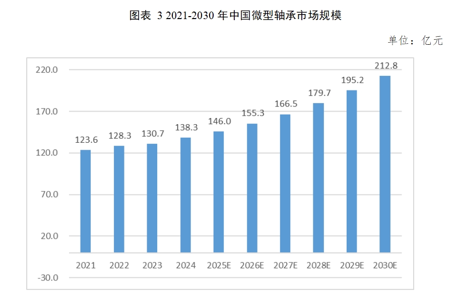 得益于在新能源汽车、智能家居、医疗设备等领域的快速扩张,以及“十四五”规划对产业基础能力建设的高度重视,中国微型轴承市场正以高于全球市场增速快速发展。数据显示,中国微型轴承市场规模已由2021年的123.6亿元增长至2024年的138.3亿元;预计至2030年,中国微型轴承市场规模可达212.8亿元,2025至2030年间的复合增长率为7.4%。