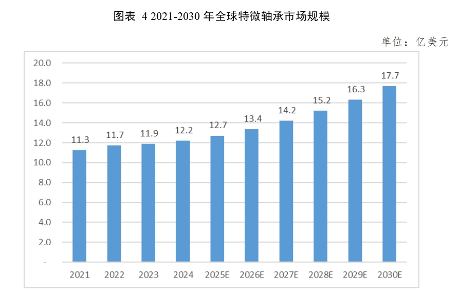 从全球特微型轴承市场数据来看,近年来特微轴承市场基本保持增长趋势,从2021年的11.3亿美元增长至2024年的12.2亿美元,预计2030年可达17.7亿美元,2025到2030年间的复合增长率6.4%。