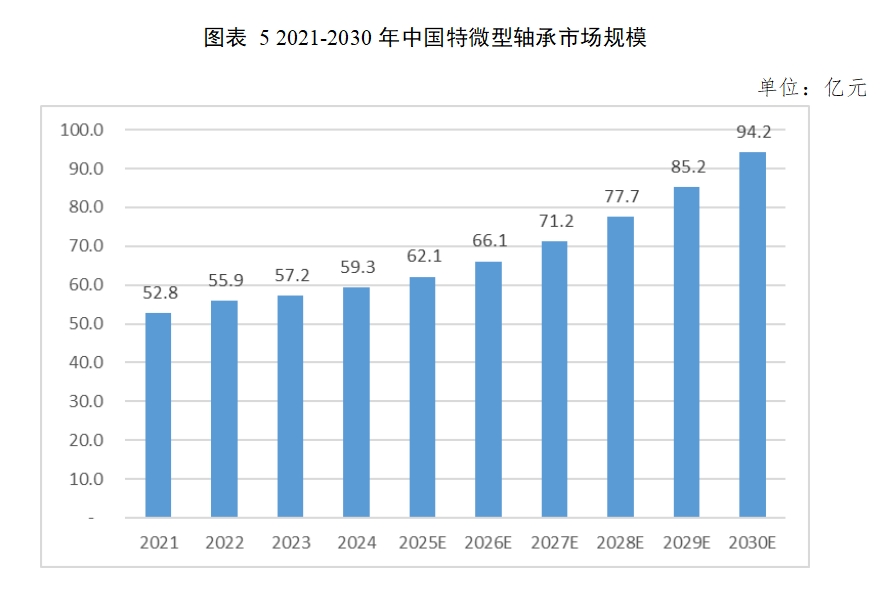 中国是全球特微型轴承最重要的市场,市场增速领先全球平均水平。数据显示,中国特微型轴承市场规模已由2021年的52.8亿元增长至2024年的59.3亿元,预计至2030年,中国特微型轴承市场规模可达94.2亿元,2025至2030年间的复合增长率为8.0%。