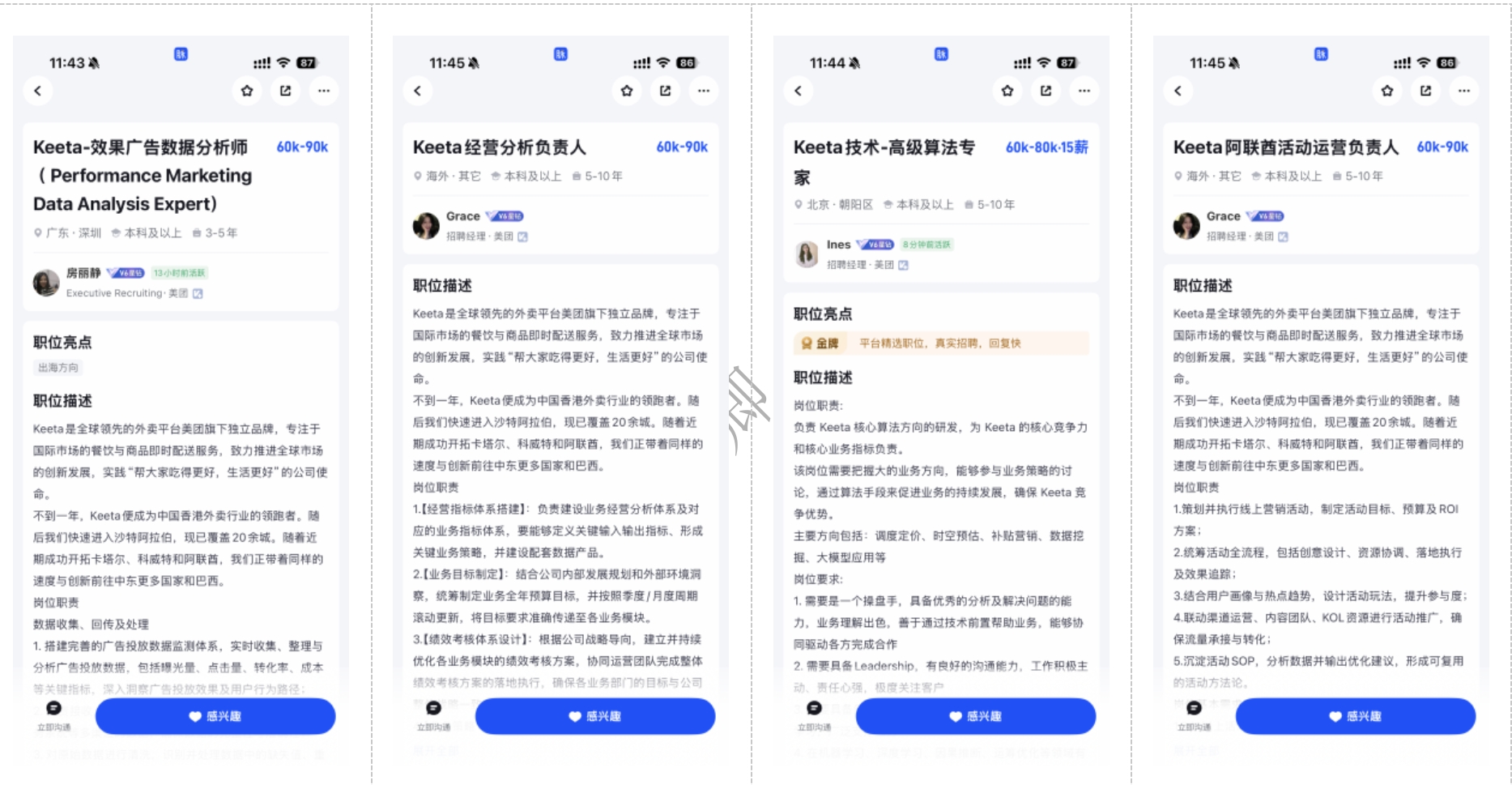 Keeta是美团推出的海外业务品牌,目前已覆盖香港、巴西、沙特、卡塔尔、科威特、阿联酋等多个国家与地区。与此同时,美团Keeta正加大人才招聘力度,在职场平台脉脉发布大量高薪岗位,包括月薪最高9万元的数据分析师、阿联酋活动运营负责人等职位,以及年薪120万元的高级算法专家职位。负责相关招聘的HR也保持分钟级活跃,持续释放岗位。