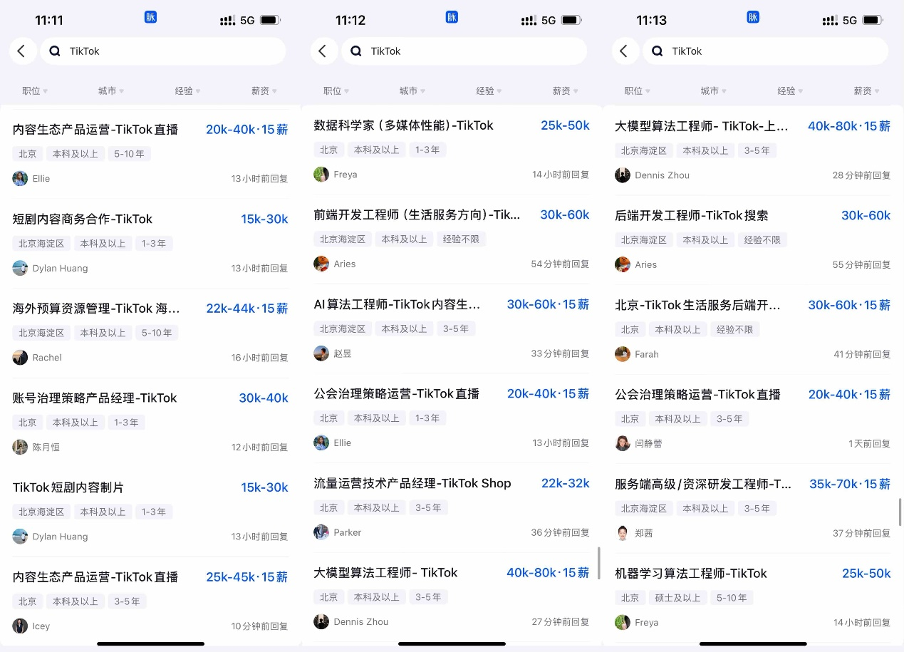 10月22日,TikTok架构再调整,1992年出生的支颖成为TikTok总负责人。随着架构调整,TikTok也加快招聘中高端人才的步伐,多位HR在求职招聘平台脉脉上保持分钟级活跃,回复候选人信息。
