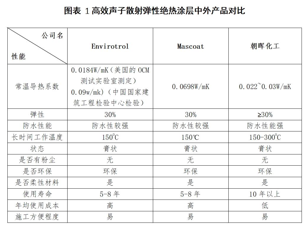 美国企业Envirotrol和Mascoat在高性能液态绝热保温涂层领域长期占据市场主导地位。两家企业掌握了从材料配方到施工工艺的专有技术,针对特定工业场景(如印染行业的高温高湿、船舶的腐蚀环境)的痛点进行深入研发,构筑较高的国际竞争壁垒。而国内企业在国家政策、地缘经济的影响下,通过积极打造行业示范、产学研合作等途径,不断突破技术封锁,如江苏朝晖化工、埃力生、志盛威华等企业已经在该领域实现零的突破,朝晖化工已经实现规模化替代,其产品在弹性适应性、使用寿命及年均使用成本等关键指标上展现出显著优势,彰显出强劲的国产替代潜力与战略价值。