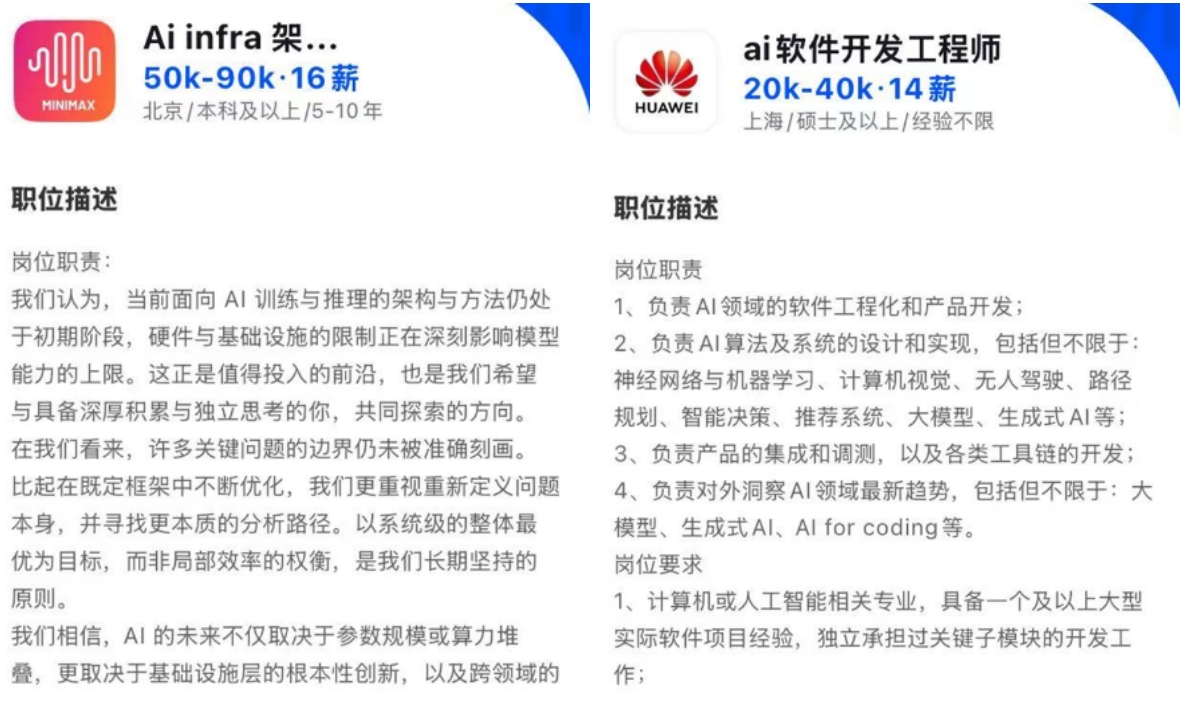 在脉脉上,华为、字节跳动等科技巨头以及MiniMax等AI领域头部企业发布了大量AI工程师相关岗位,比如AI软件开发、AI应用研发专家、AI算法工程师等,年薪最高可达140万元。2025年9月,中国AI相关新发岗位数量同比增长11倍,1000多家AI公司在脉脉上发布的AI岗位超过7.2万个,多家企业高管亲自下场招聘,HR、猎头分钟级活跃,快速捕捉AI人才动态。