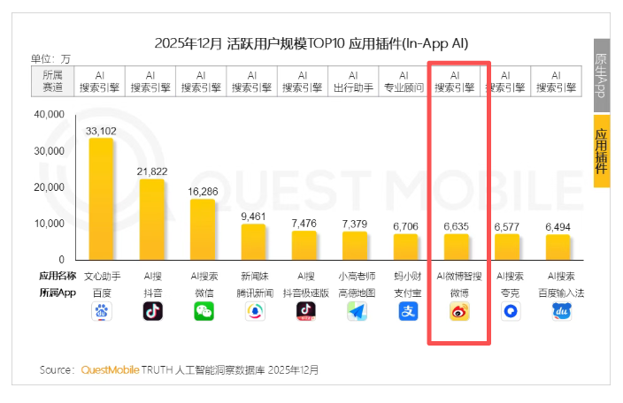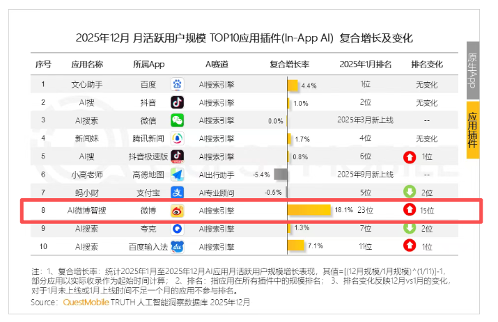 值得注意的是,相比于近日“红包决战”吸引外界高度关注的独立原生App赛道,由头部互联网平台主导的“应用插件(In-App AI)”形态正凭借庞大的用户基数和天然的场景优势,成为承载网民日常AI体验的核心主力。其中微博智搜2025年12月活跃用户规模超6600万、复合增长率达18.1%,在月活规模TOP10的应用插件中,微博智搜复合增长率排名第一。