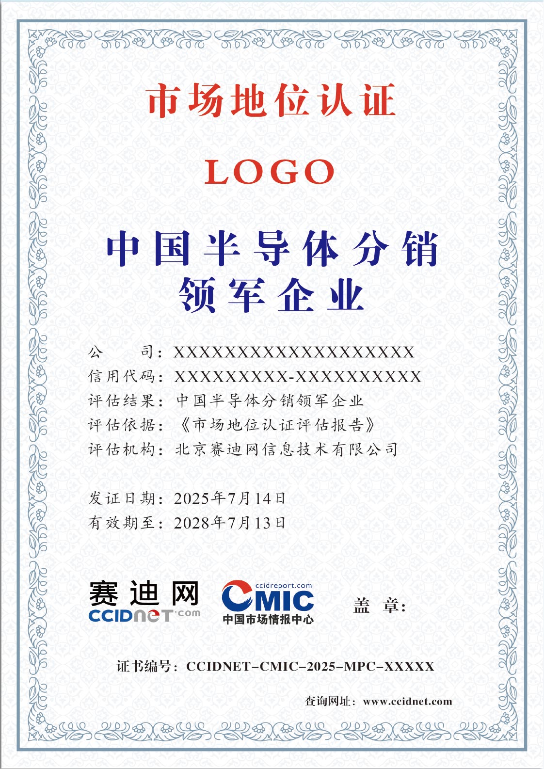 市场地位认证是由北京赛迪网信息技术有限公司(隶属工信部中国电子信息产业发展研究院)旗下中国市场情报中心推出的权威第三方证明服务。该认证基于专业的行业调研与数据分析,为企业提供在市场占有率、销售排名、技术领先性、用户规模等方面的客观评估与法律背书。认证报告及证书广泛应用于政策申报、融资上市、品牌宣传、招标投标等场景,有效提升企业公信力与行业竞争力,是彰显企业市场实力、获取资源支持的重要工具。