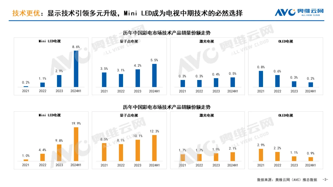 电视行业一路发展,画质的提升始终是其不变的追求,指引着行业不断前进与革新。随着消费者对图像质量、色彩精准度和清晰度的期望不断提高,电视制造商面临前所未有的挑战与机遇,迫切需要寻求创新以满足多样化需求。Mini LED技术作为液晶继续进化的产品,正逐渐成为电视行业的重要发展方向。根据奥维云网(AVC)推总数据显示,2024上半年中国彩电市场Mini LED产品零售量份额为8.6%,较去年全年提升5.7个百分点,零售额份额为19.9%,较去年全年提升10.1个百分点。十一国庆促销期内Mini LED成为中国彩电新技术市场的增长主力,线上市场Mini LED产品销量份额为28.9%,较去年同期增长了26.4%;线下市场Mini LED产品销量份额为27.4%,较去年同期增长了20.2%,成为显示技术中增速最快的一类细分产品,这些数据均反映了Mini LED电视在大规模放量阶段取得了显著的增长。随着技术的成熟和成本下探,预计在未来几年内Mini LED电视市场将持续走强。
