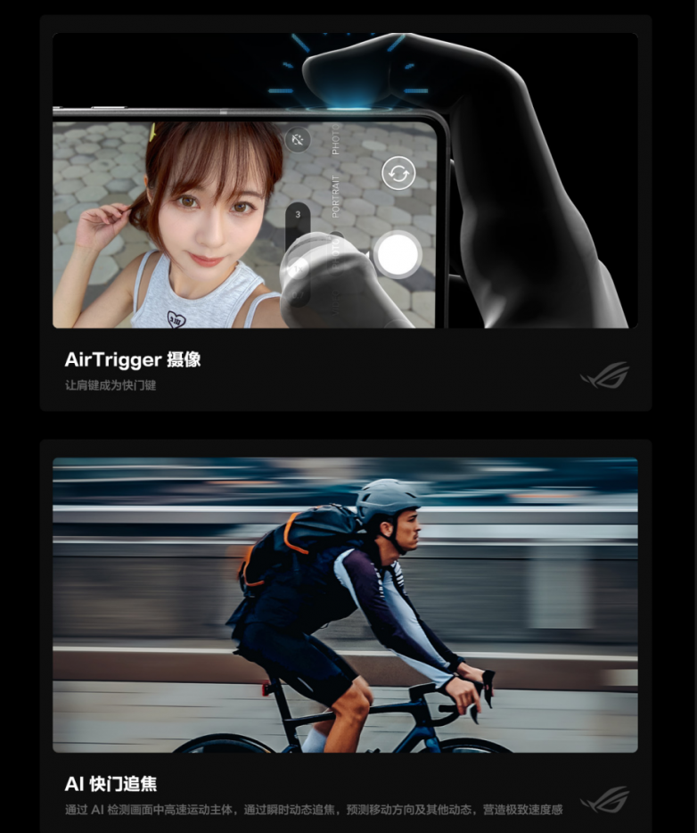 为提升各种拍摄环境下的成片率,ROG 9系列通过AI带来了诸多实用的摄影功能。比如快门追焦,AI可检测运动主体,打造出速度感的照片;夜视录影在先进AI算法支持下,能减少夜间视频录制的噪点,确保弱光环境下也能拍出高清晰度的视频;对于因手抖产生的模糊照片,ROG 9系列提供的AI模糊修复可消除模糊画面,让原本模糊的“废片”秒变高清大片。ROG 9还新增了AirTrigger摄像功能,让你的肩键秒变快门键,拍摄更快、更方便。