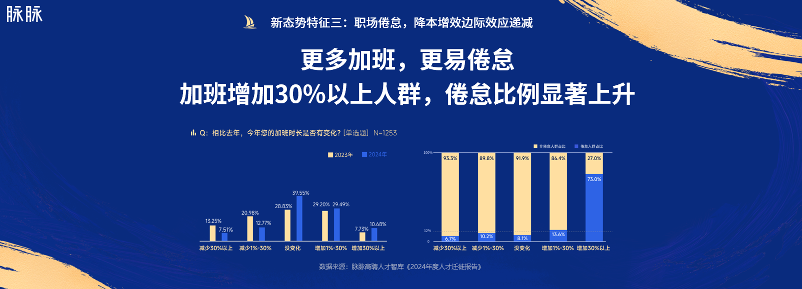 供需失衡的结果之一就是,2024年有66.8%的职场人感受到了明显的压力上升,处于高度职业倦怠状态的职场人占比为12.4%。承压成为未来职场新态势。以上数据皆来自脉脉高聘人才智库发布的《2024年度人才迁徙报告》。