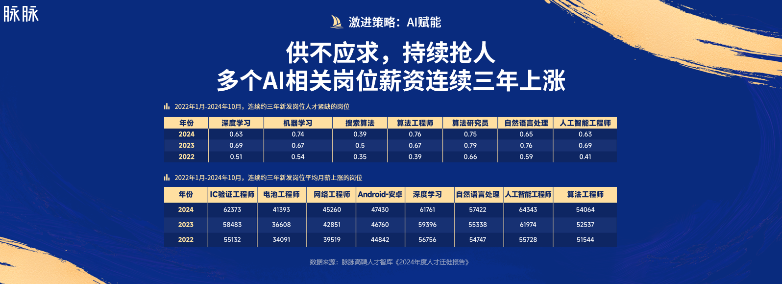 另一个企业广泛选择的打造业务韧性的方式是AI赋能。林凡指出,所有类型的公司都有可能在AI时代获得机会,所有类型的公司也都在吸纳AI人才。近三年,多个AI岗位持续面临人才短缺的问题,深度学习、机器学习、搜索算法、算法工程师、算法研究员、自然语言处理以及推荐算法等岗位近三年的人才供需比均低于1。同时,多个AI岗位薪资连续三年上涨,其中,深度学习、人工智能工程师、算法工程师和自然语言处理的平均月薪均超过5万元。