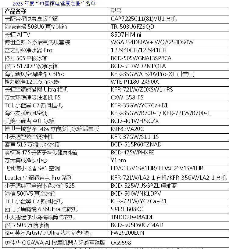 主办方组织专家从产品健康性能、技术特点、设计理念及应用状况等进行评审,最终29款年度热销健康家电产品(详见下表)因在产品性能、技术特点、设计理念、应用场景上紧扣“健康”发展趋势,满足消费者健康需求,通过层层选拔脱颖而出,成为2025年度“中国家电健康之星”。