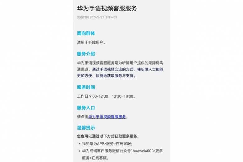 每一个听障用户带着困惑与期待所提出的问题,都有华为手语视频服务客服默默提供的支撑。华为手语视频服务不仅是一项服务,更是一位相伴用户的挚友,它陪伴听障群体跨越数字鸿沟,融入有声有色的现代生活,让温暖与关怀在无声世界里肆意流淌。