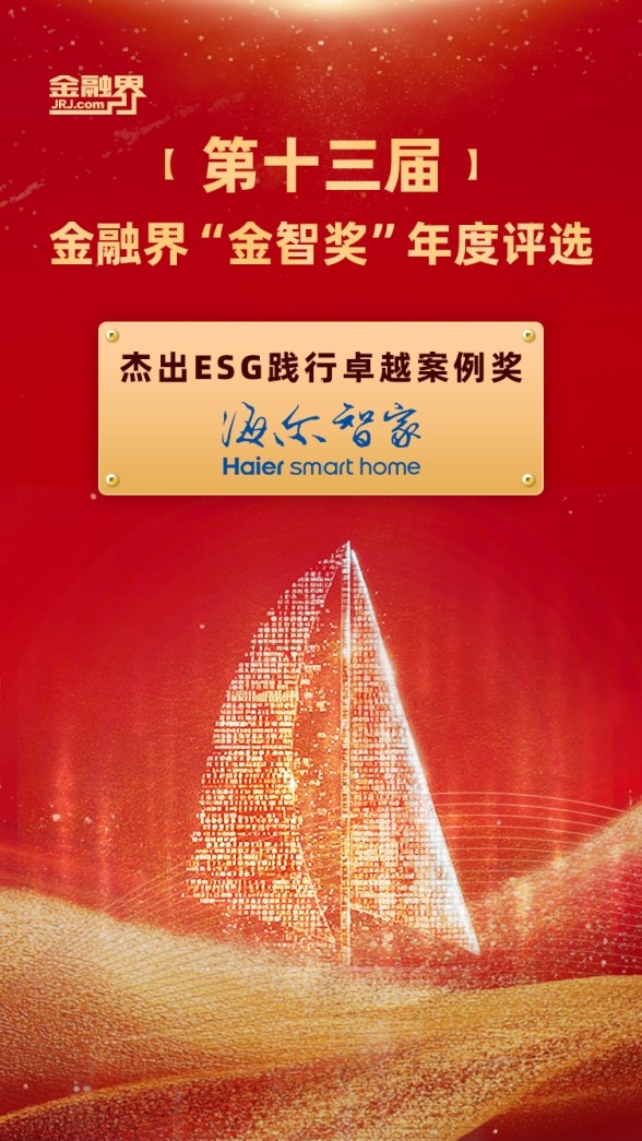 近日,由金融界主办的第十三届领航中国“金智奖”年度评选结果正式揭晓。其中,海尔智家凭借其在绿色低碳、社会责任等方面的实践探索,荣获“杰出ESG践行卓越案例奖”,成为行业唯一获奖企业。