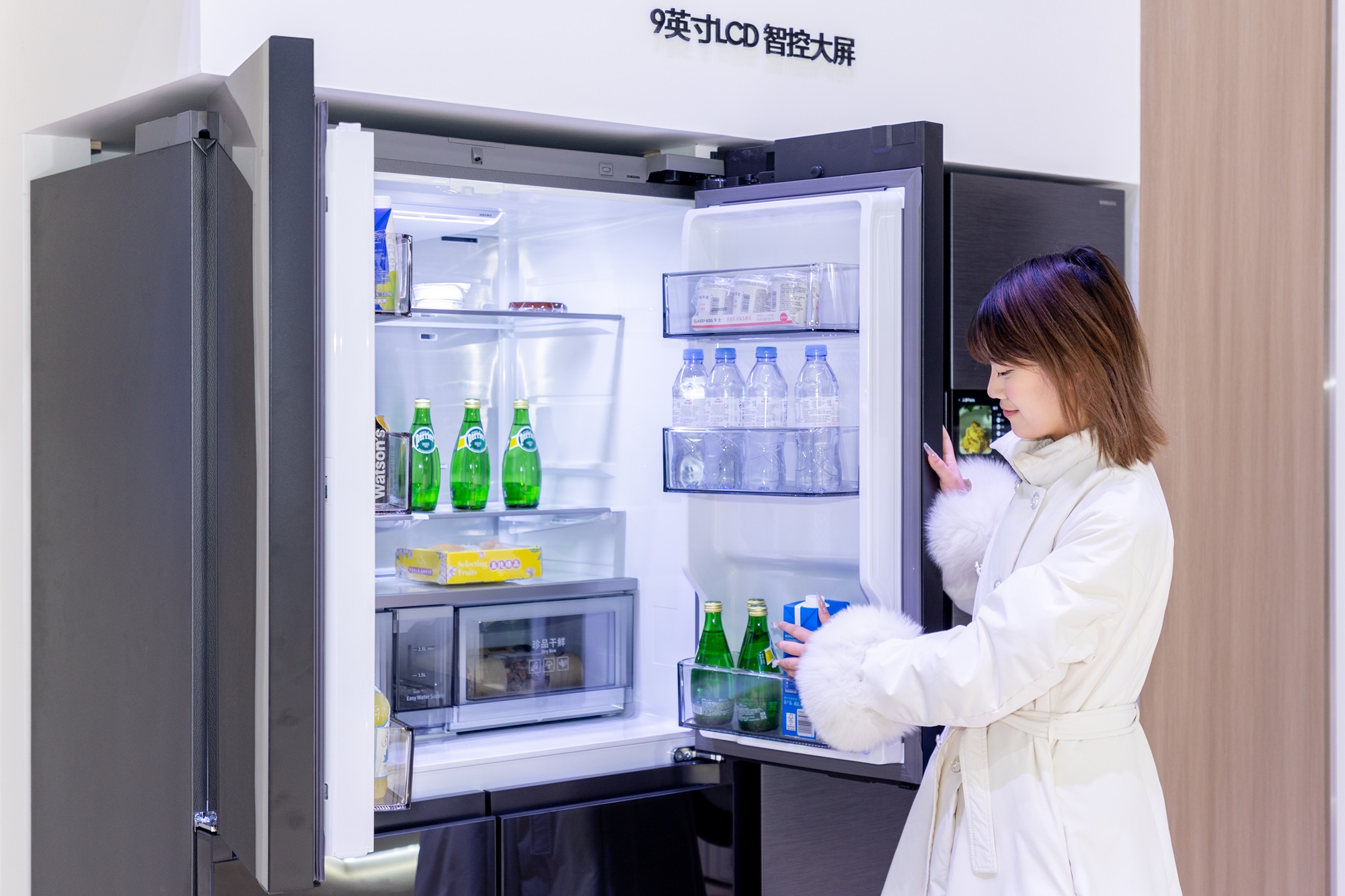 随着消费者对品质生活要求的不断提高,冰箱在食物保鲜的单一属性基础上,逐渐被赋予了更多精细化、健康化、智能化的定义。AWE 2025现场,三星带来了多款AI神冰箱产品。其中,全新亮相的三星AI神 冰箱9系以突破性智慧科技重新定义厨房交互方式。9英寸智控大屏集成了食材管理、居家应用等功能,通过内置的智能信息板直观展示SmartThings连接下的家用设备状态,并实时提供天气、日程等信息。结合Bixby智能语音助手,用户可通过语音指令轻松实现多功能操控,进一步提升产品使用的智能化与便捷性。三星AI神冰箱9系支持语音+触控两种方式的自动开门功能,当用户双手持物不便操作时,只需轻轻一唤或一触,即可实现轻松开门。
