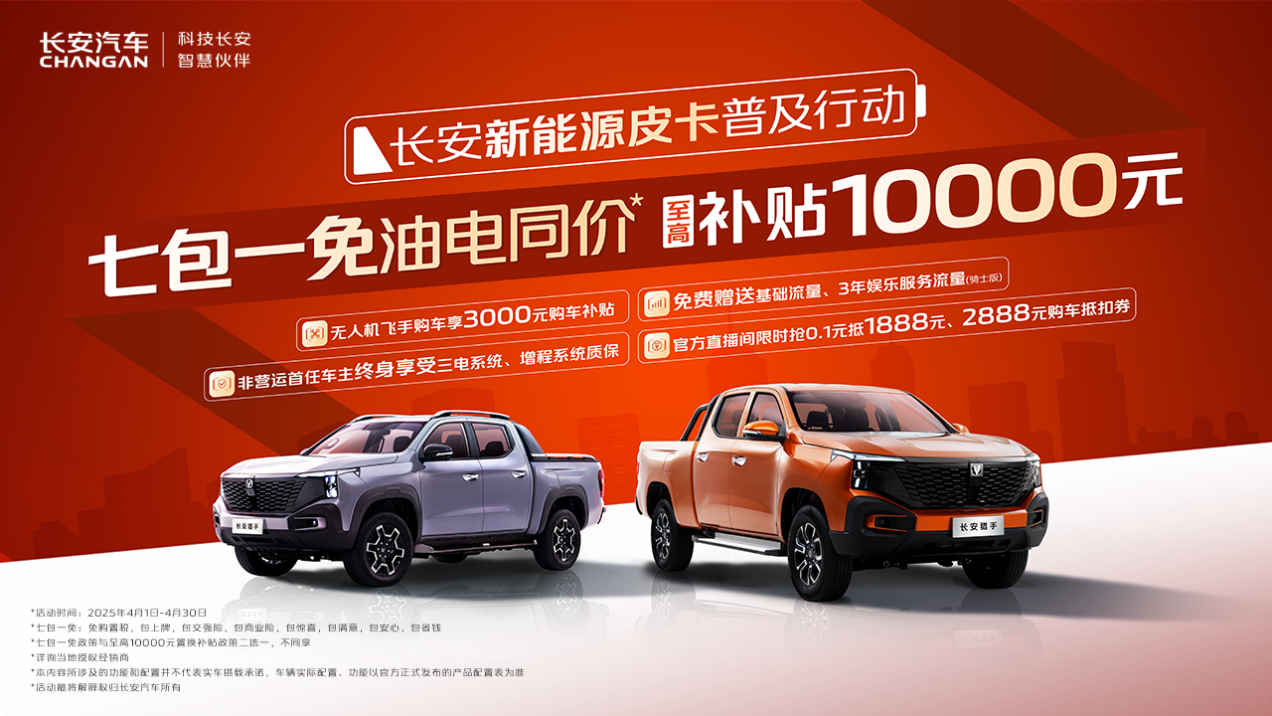 春意渐浓,购车正当时!四月伊始,长安皮卡火力全开,以多重优惠福利,掀起新一轮购车热潮。全球首款超级大增程皮卡长安猎手七包一免、油电同价,至高补贴1万元。览拓者与F70蓝鲸版强势加入战局,综合优惠至高2.5万元。以多元皮卡矩阵,满足用户城市通勤、户外越野、创业致富的全场景需求。