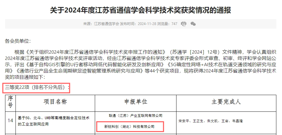 近日,江苏省通信学会正式公布了2024年度江苏省通信学会科学技术奖名单,新锐科创(湖北)科技有限公司携手联通(江苏)产业互联网有限公司,凭借“基于5G、北斗、UWB等高精度融合定位技术的工业互联网应用”项目成功摘得三等奖。