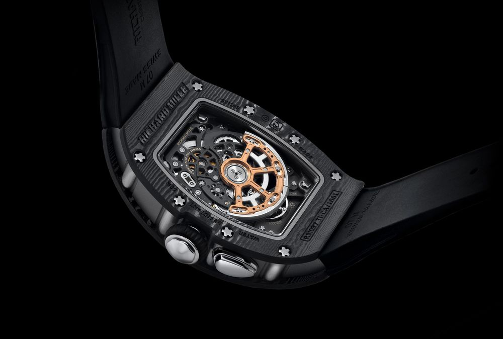 CRMA1搭载了品牌创新设计的表冠柄轴机制。传统机制要求将表冠直接与机芯内部相连,这种直接连接可能在机芯承受压力时造成损坏。而在RM 037腕表中,表冠被整合到表壳结构之上,尽可能地减小表冠受到冲击后脱落或折断的风险。